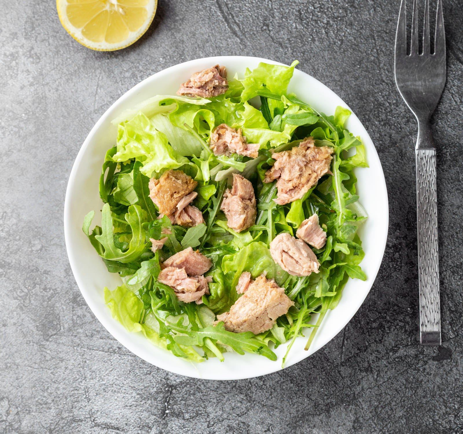 Finely chop the lettuce leaves and mash the tuna with a fork. Toss the salad, add arugula, herbs and season with lemon juice, olive oil and spices.